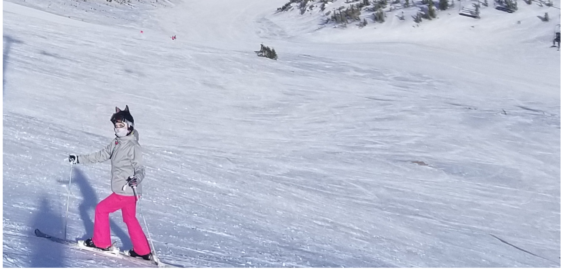 Amelia descends on Dave's Run (diamond) above the top of High-Five Express, loops behind the peak to arrive atop Dry Creek (diamond)