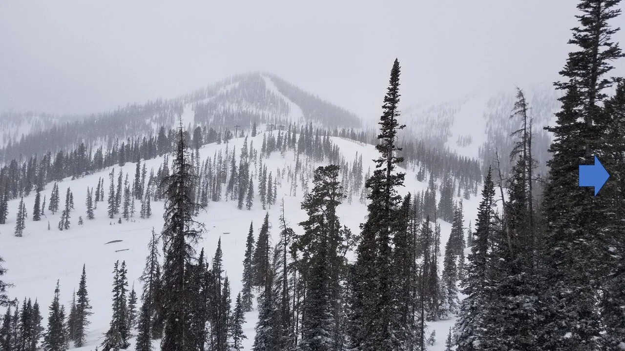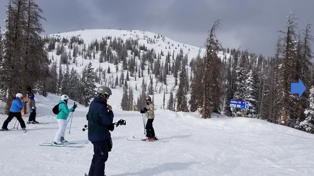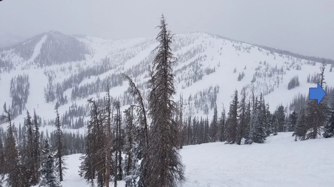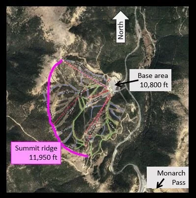 The high point is not a single peak, but rather a ridge, a segment of the spine in the great divide, with most of the slope facing east and north, with some southern-facing component under the Breezeway chair.