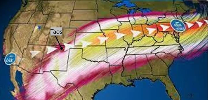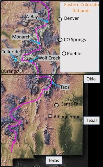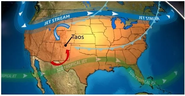 Prevailing climate patterns bring moisture from the Pacific across warm low-lying regions of Mexico, New Mexico, and Texas. Colder air migrating south from the frigid Rockies at 10,000 to 14,000 ft creates a storm front to drop powder in Northern New Mexico and Colorado, with dry dessert snow plentiful at higher elevations (above 10,000 ft)