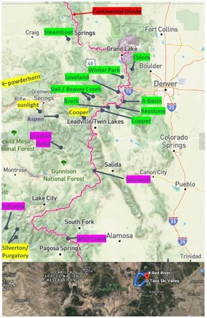 After this southern Colorado road trip, we’ve skied most of the big-name destinations in Colorado - Green names are those we’ve skied thus far.