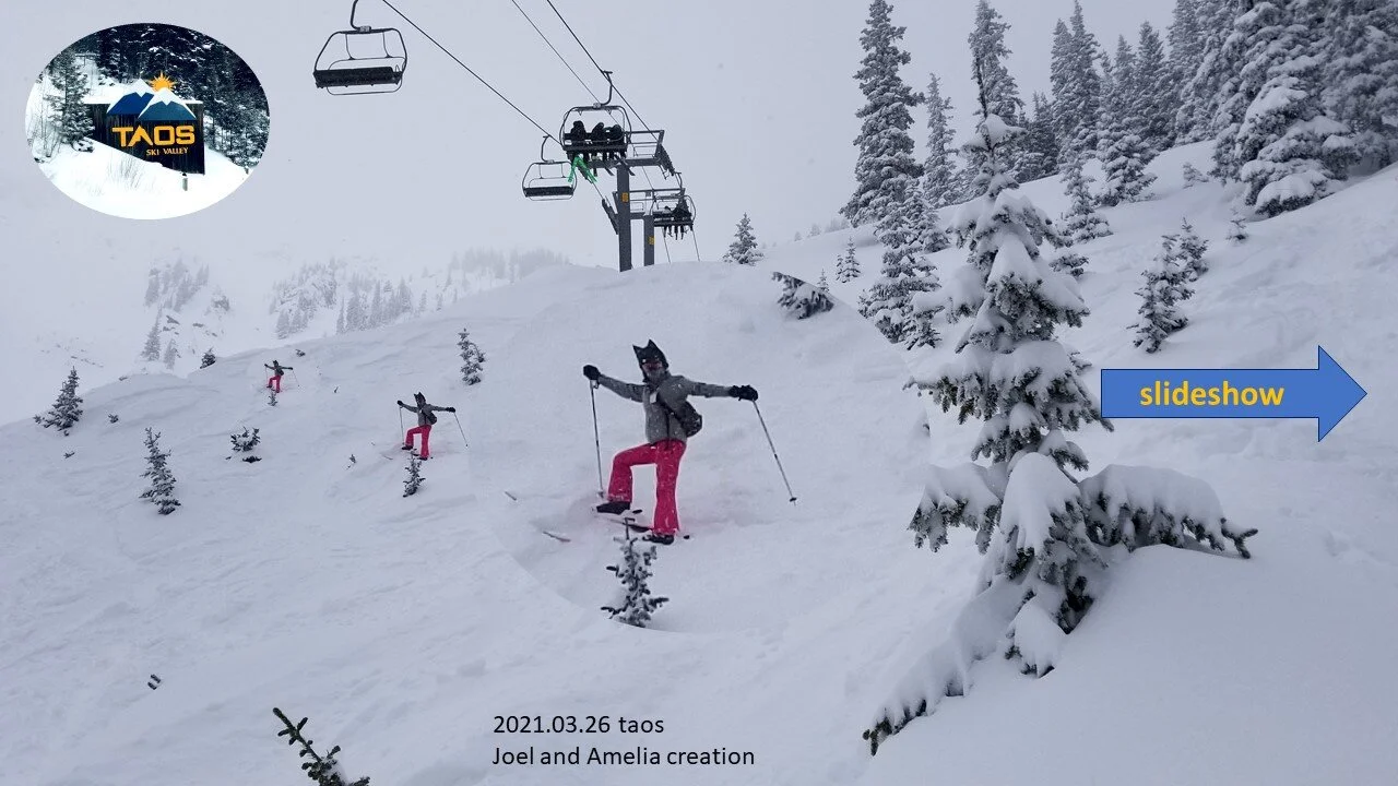 We caught Taos on a high-elevation powder day in late March. Amelia grew to love powder trees. Joel is now intrigued by the idea of New Mexico as a ski destination. A real happy place find.