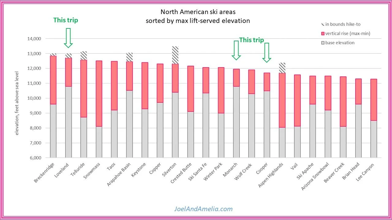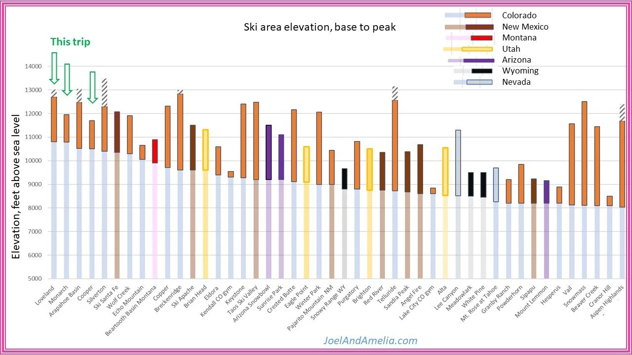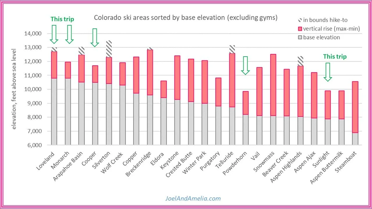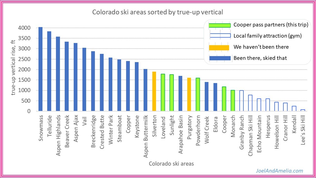 So there’s not a lot of vertical drop at these ski areas. As Colorado vertical goes, these are among the smallest in the state… in “delta” feet. Absolute verticals tell a different story.