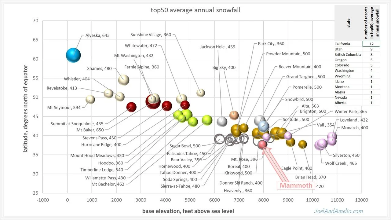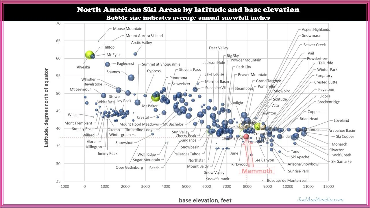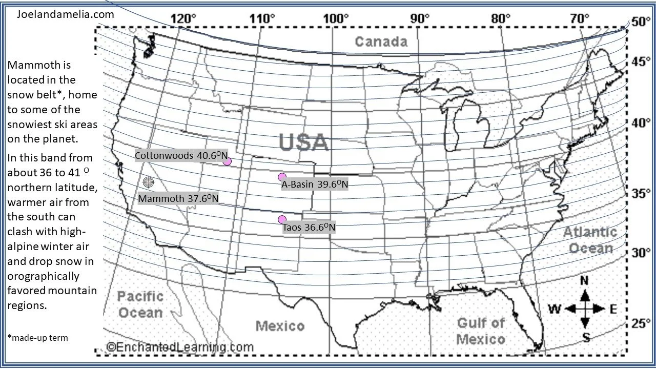 Mammoth is among the southern-most ski area on the continent, at a balmy 37.6 degree Northern latitude. This puts it on the low end of what I call the “snow belt” — a band from about 36 to 41 degrees, along with high mountains good regular big dumps of low-elevation dessert snow.