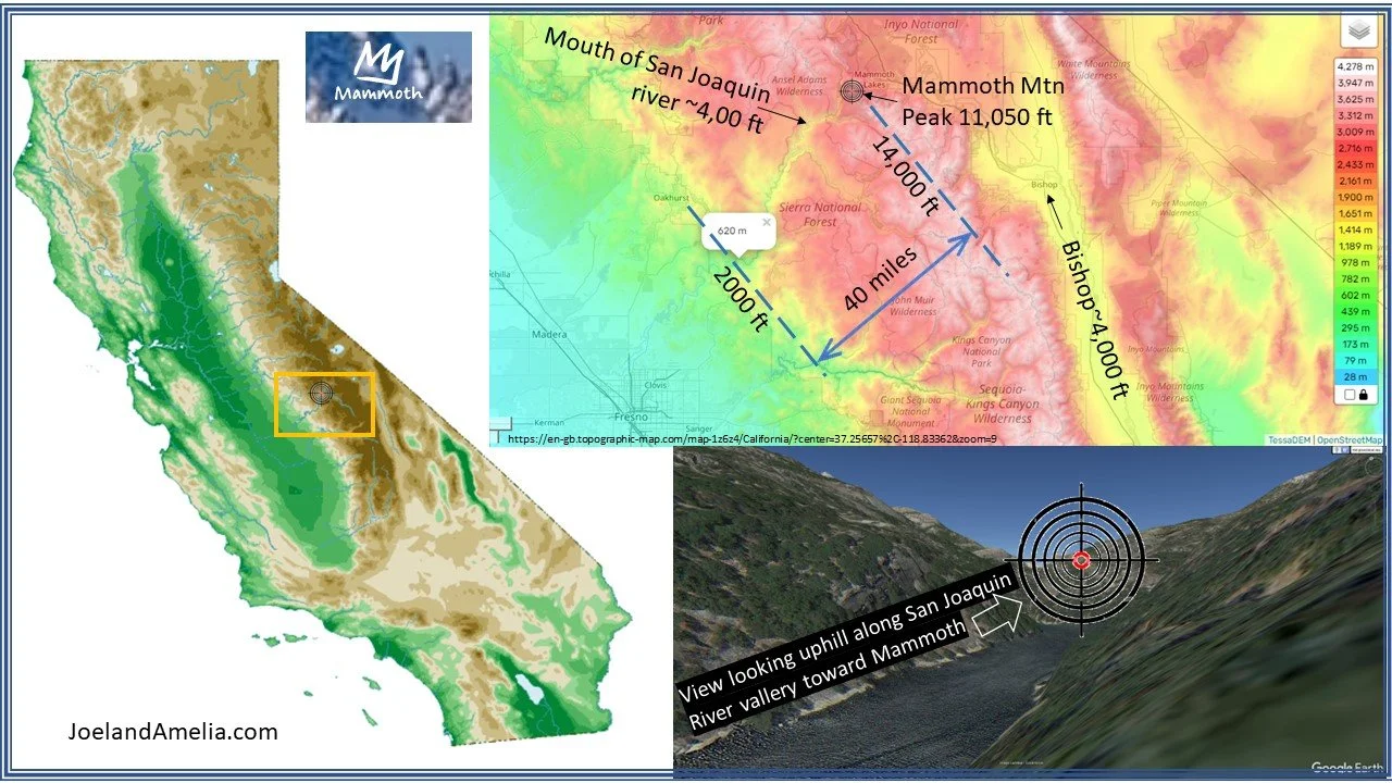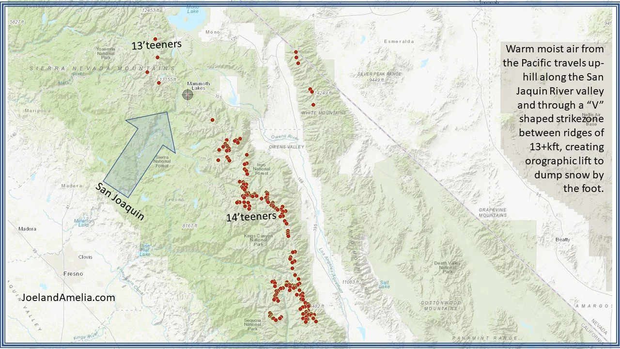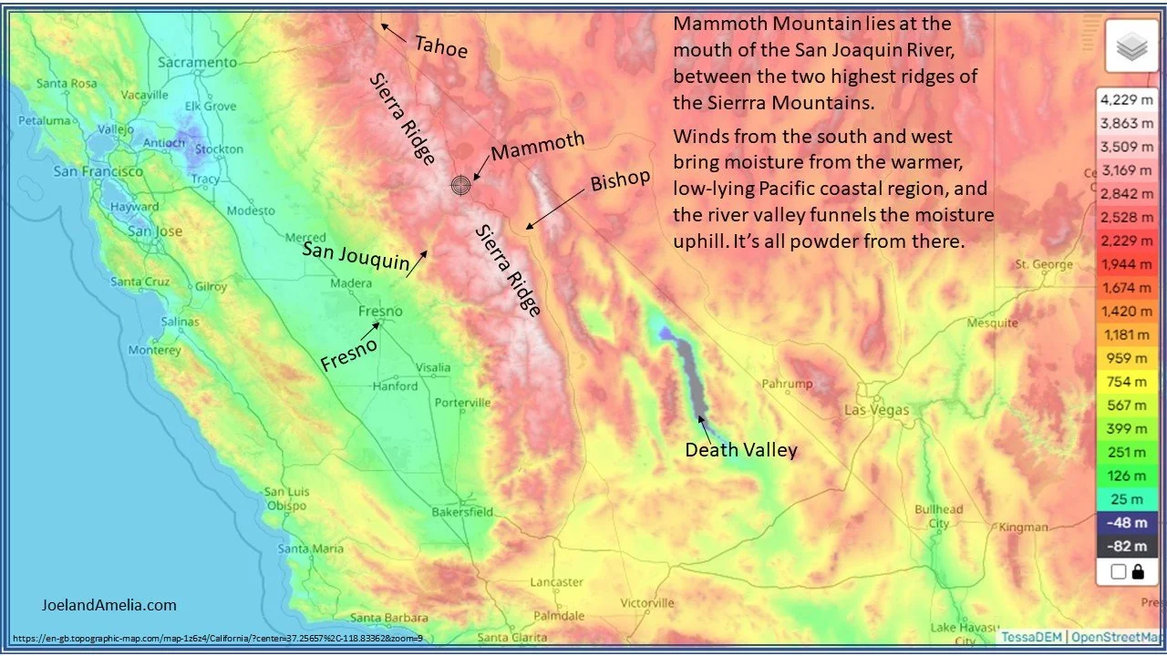 Mammoth Mountain is located on the east side of the mighty Sierra Nevada Mountain Range (hereafter “Sierra”), among peaks over 14,000 ft, and near Yosemite National Park. The highest point point in North America (excluding Alaska), Mount Whitney lies just to the south, at 14,505 feet peak elevation. Death Valley at -282 feet. Warm waters of the south Pacific are just over the ridge, and low-lying coastal population centers are not more than 50 miles west. These are the most extreme rises in elevation sustained over a narrow run of a thin strip of mountains running east and west, from the barren desserts of Las Vegas to the shores of Lake Tahoe.