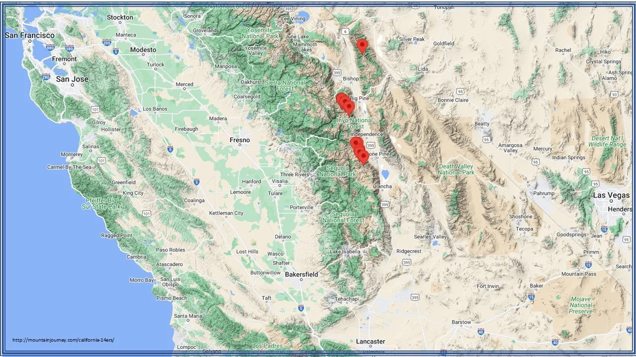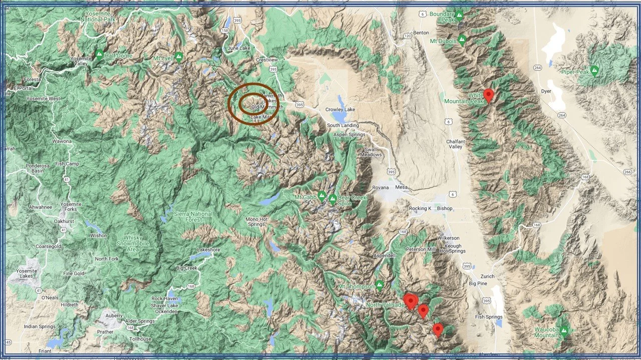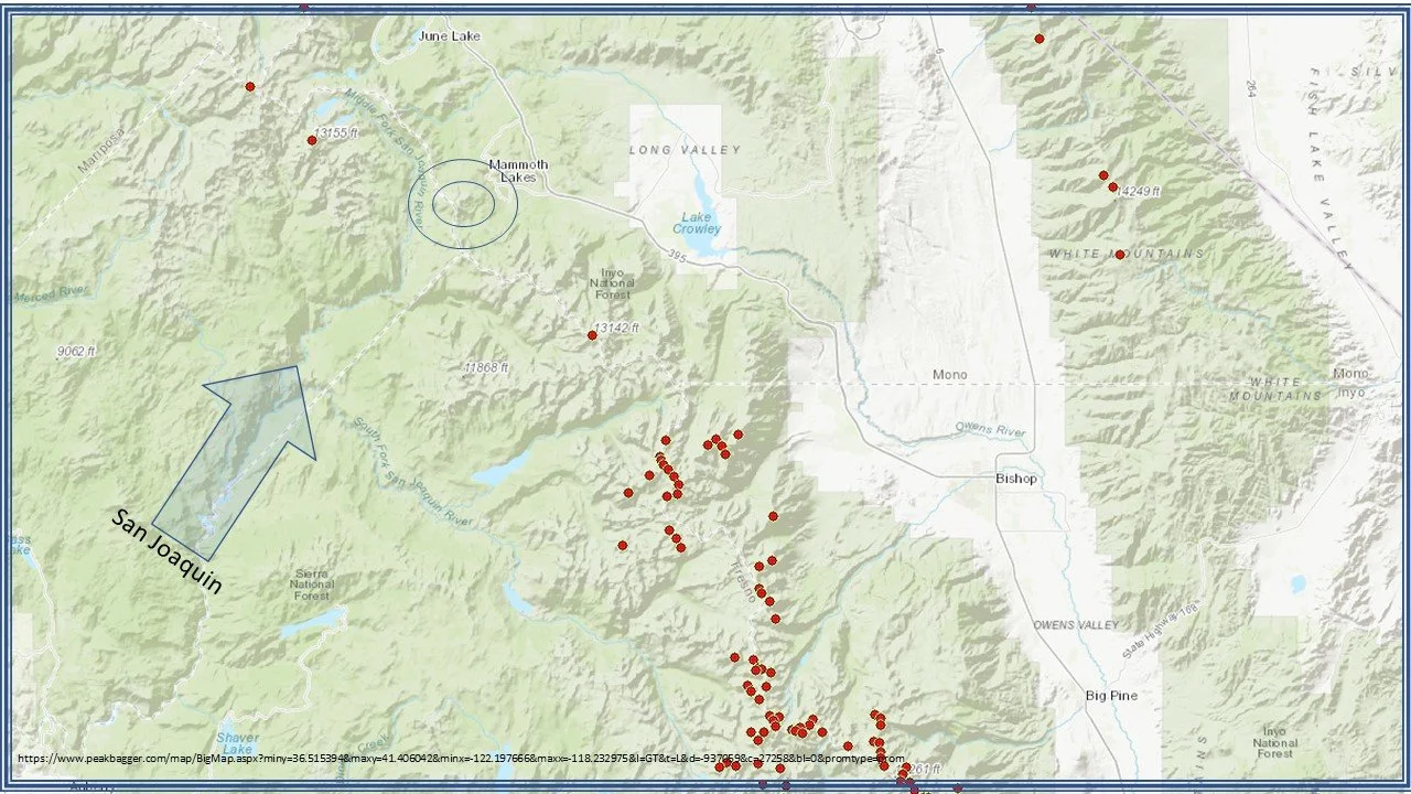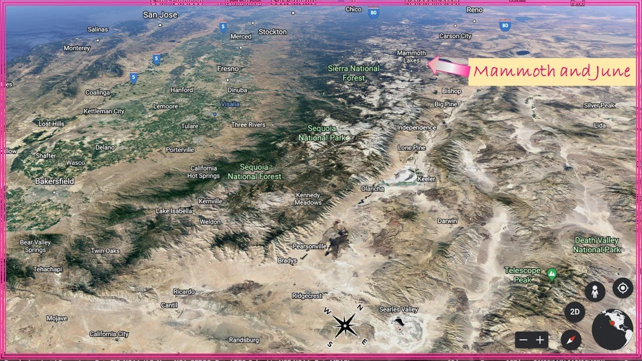 Mammoth Mountain is located on the east side of the mighty Sierra Nevada Mountain Range (hereafter “Sierra”), among peaks over 14,000 ft, and near Yosemite National Park. The highest point point in North America (excluding Alaska), Mount Whitney lies just to the south, at 14,505 feet peak elevation. Death Valley at -282 feet. Warm waters of the south Pacific are just over the ridge, and low-lying coastal population centers are not more than 50 miles west. These are the most extreme rises in elevation sustained over a narrow run of a thin strip of mountains running east and west, from the barren desserts of Las Vegas to the shores of Lake Tahoe.