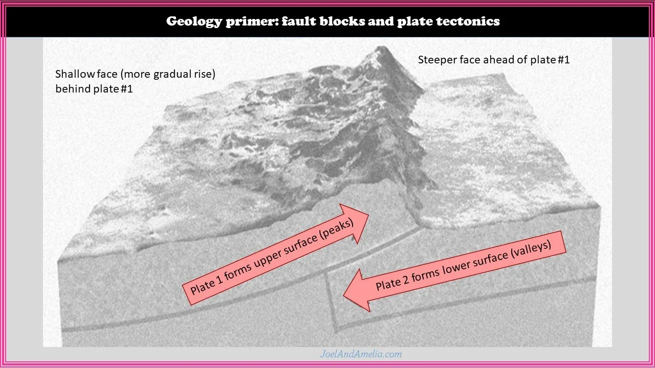 Mammoth Mountain is located atop a fault block. This occurrence of plate Techtonics explains why they’re called “high Sierra”. As shown below, the approaching plate gradually works its way upward, followed by a sharp, steep, fall to the valley formed by the cross-drifting plate.