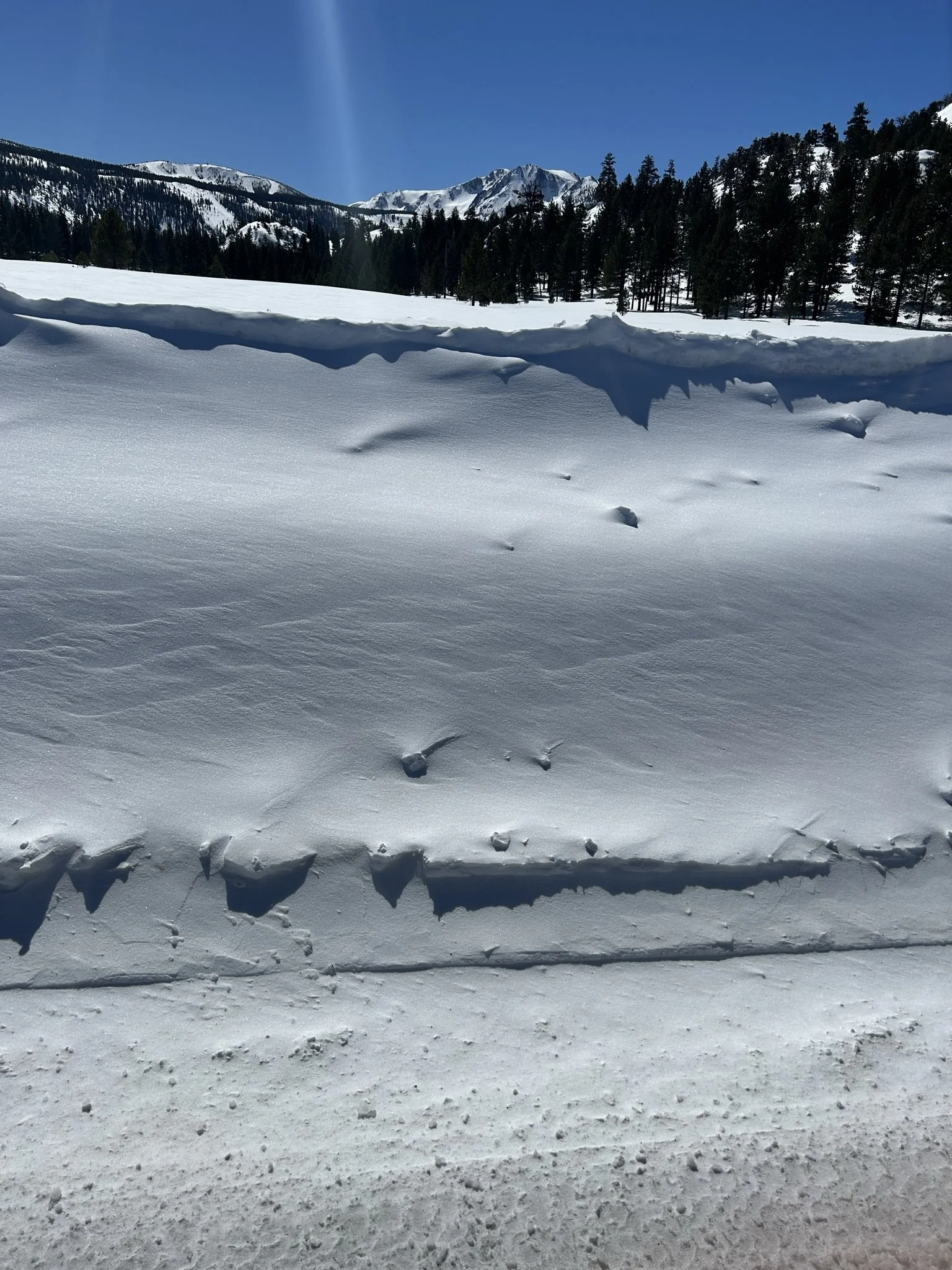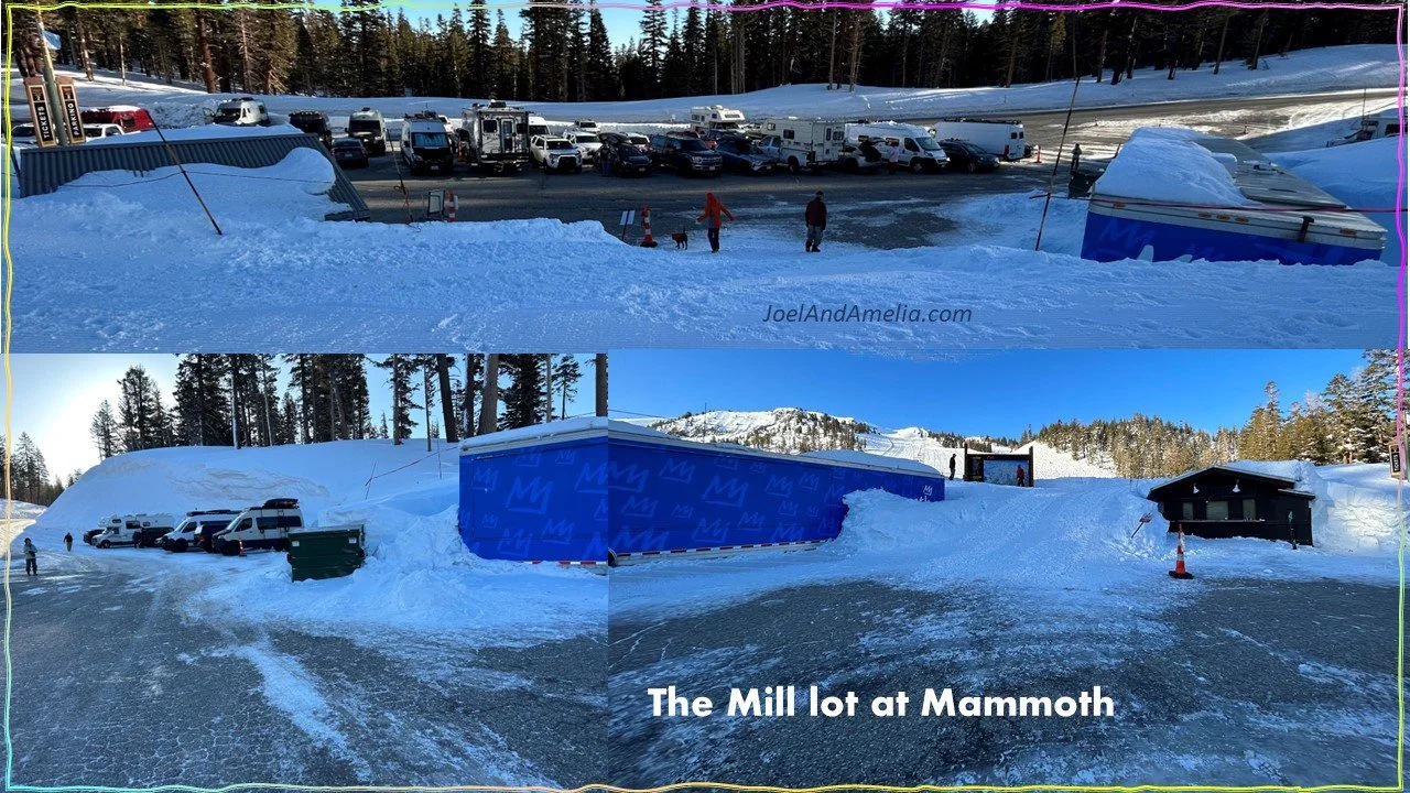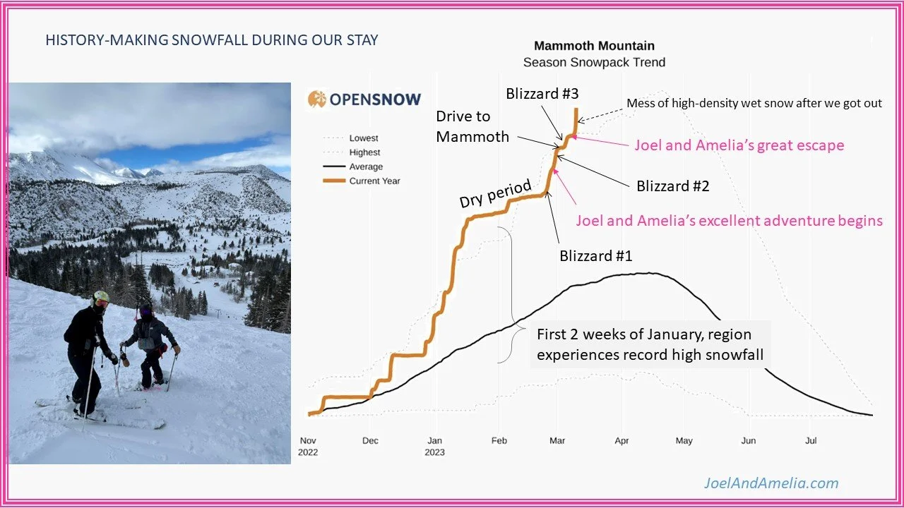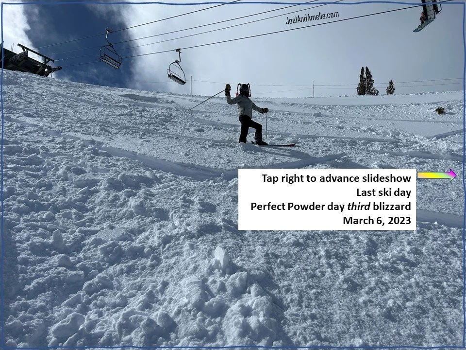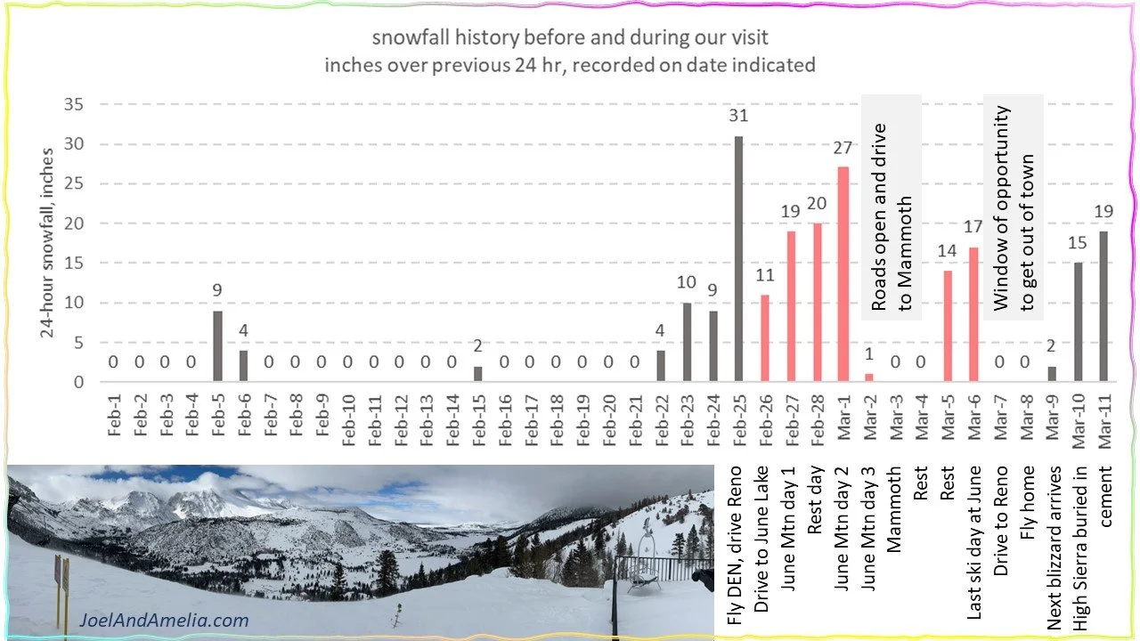 The pow we scored was mostly light and dry (part of why the big inch totals). There was a break of a few clear days, during which CA DOT dug out Hwy 395, enabling passage to Mammoth (this route had been closed in the during and after blizzards 1 and 2.). We caught one day (3-Mar) of clear passage to Mammoth, and were otherwise snowed-in at June Lake, with the next day of road openings not until Mar-7, during which time we hunkeree