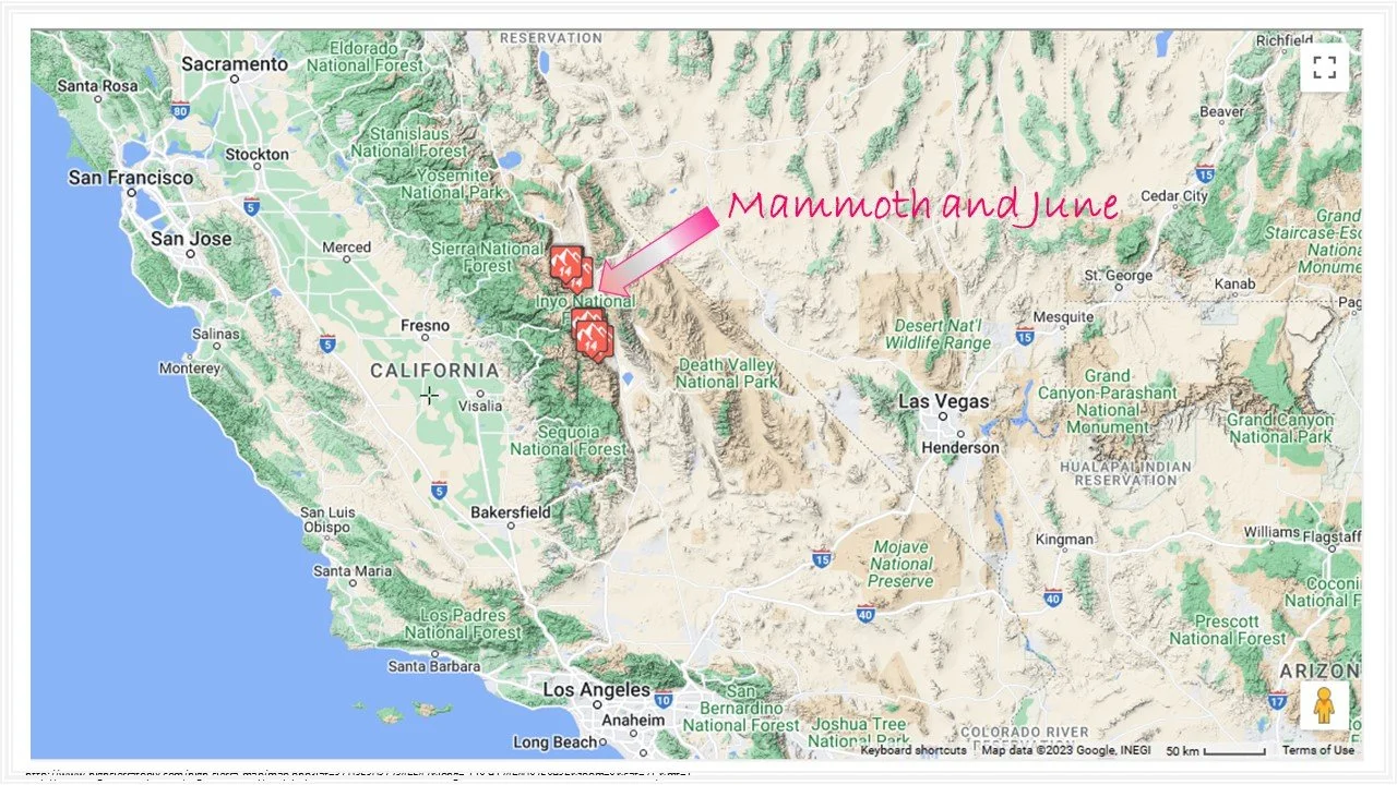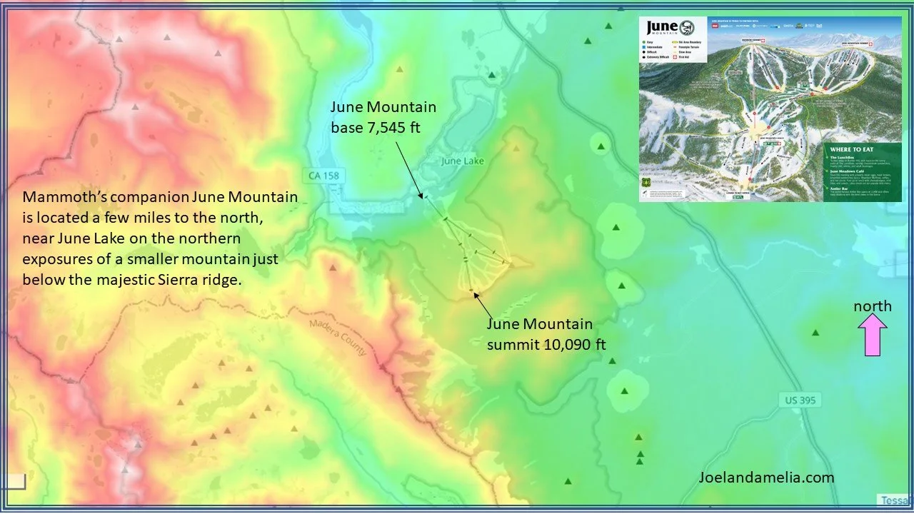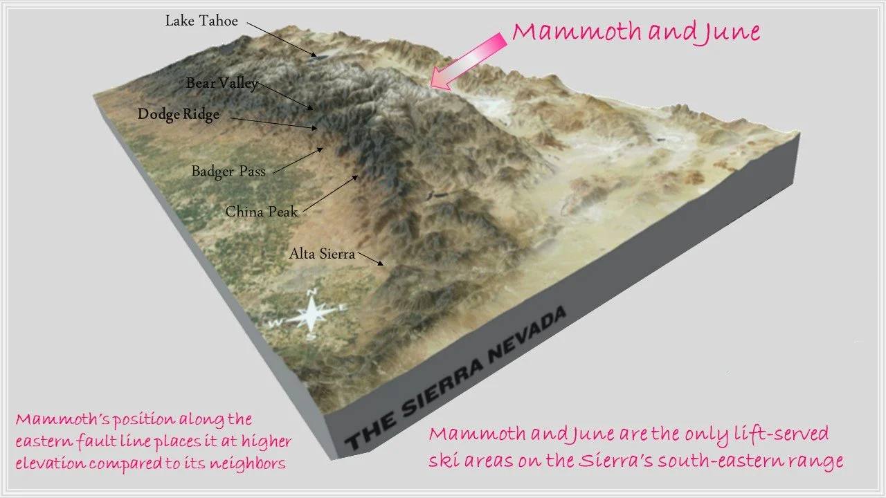 Mammoth and June are positioned along the steep Eastern Face, where elevation maxes out above 14,000 feet..