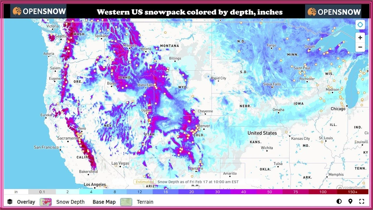 A series of strong storms during the first two weeks of January set the stage for us, with a nice deep base, well above most nuisance rocks. But then it went dry.. and stayed dry, for nearly a month (there was one 9” day in there). Our original plans had us there toward the end of the dry spell, possibly with travel issues getting out in the first big storm to come through in nearly 4 weeks. We made good use of forecast data from OpenSnow and did the powder chasing thing .. moved our trip plus one week arriving instead after what would prove to be the first in a round of several high-energy winter storms, through the end of February and as far as I can see now into March.