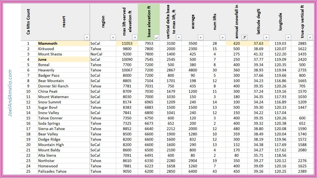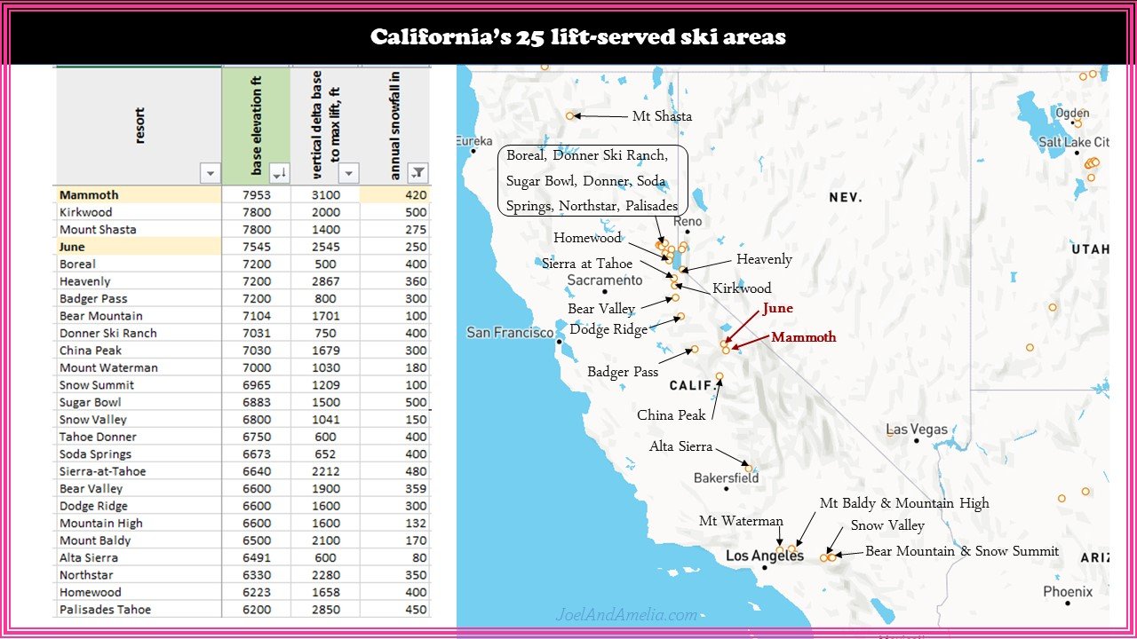 There are plenty of ski areas in California, 25 by my count (figure 2). Of those, nearly half are congregated around lake Tahoe, a few are spread across the Western face of the range and easily accessible from the low lands. Half a dozen of them are down near LA and primarily serve the locals. Shasta is off on its own in the Northern part of the state, and then there’s Mammoth and June .. over the range and on the other side.
