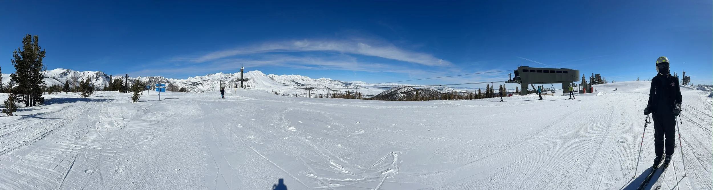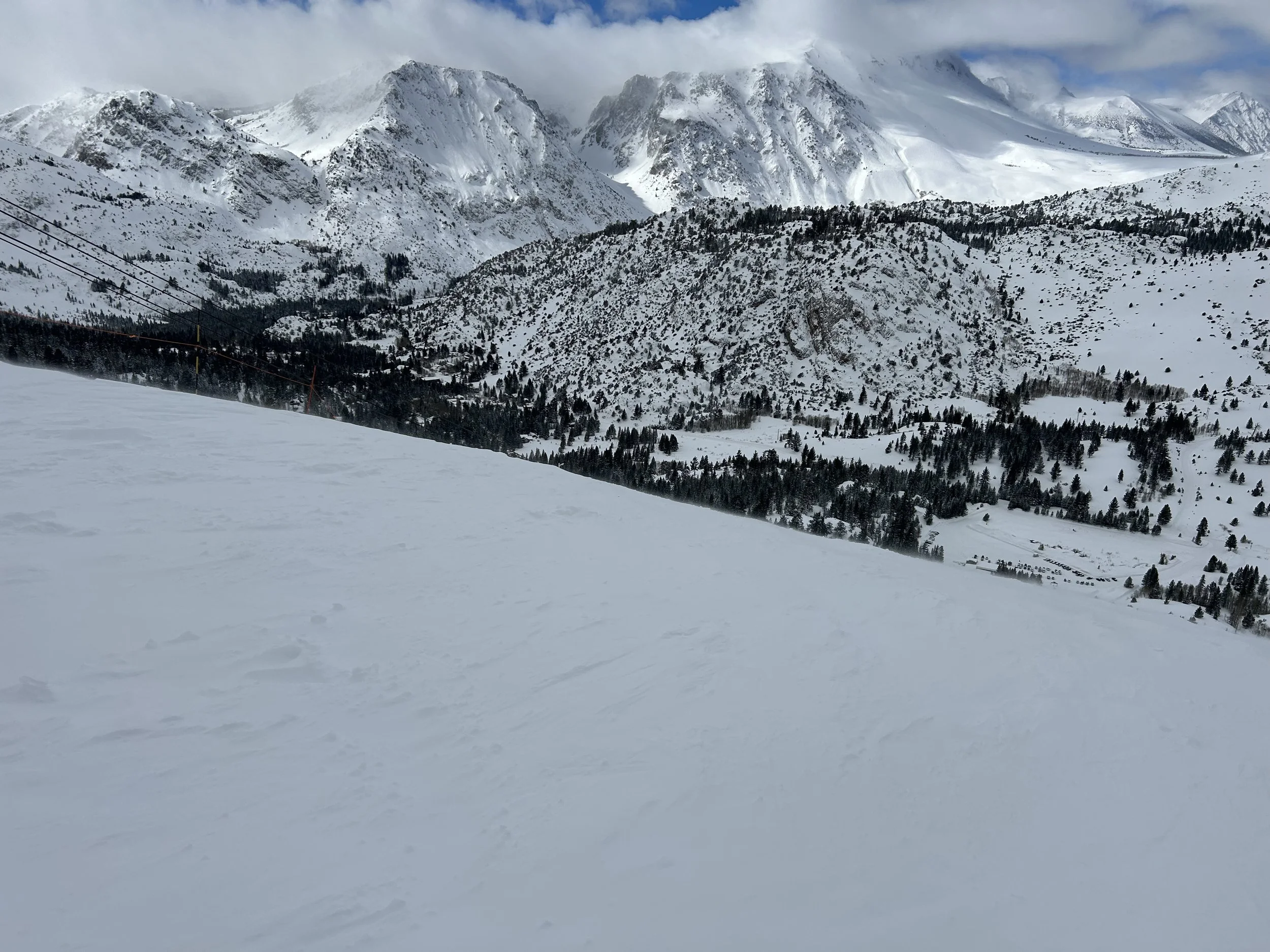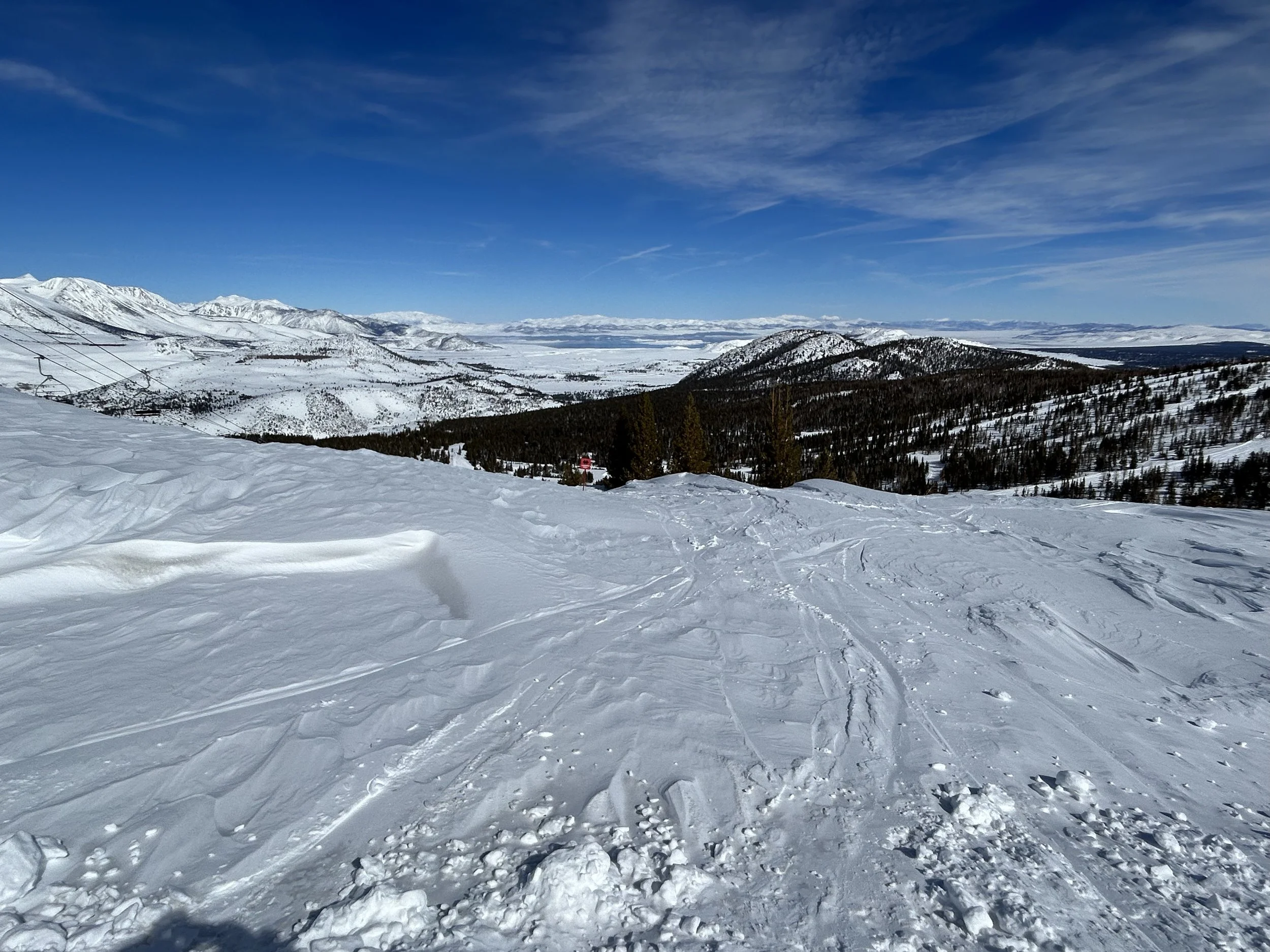 Mammoth is not the biggest ski area you can find, although it is plenty big. Probably not the steepest either, although steep slopes, chutes, and glades aboud. Its averaage annual snowfall is quite impressive, at about 420 inches at the main lodge, and over 500 inches at the summit. By my count, this places it in the upper eschelon of snowy-est mountains in North America (and, along with Japan, in the world.)