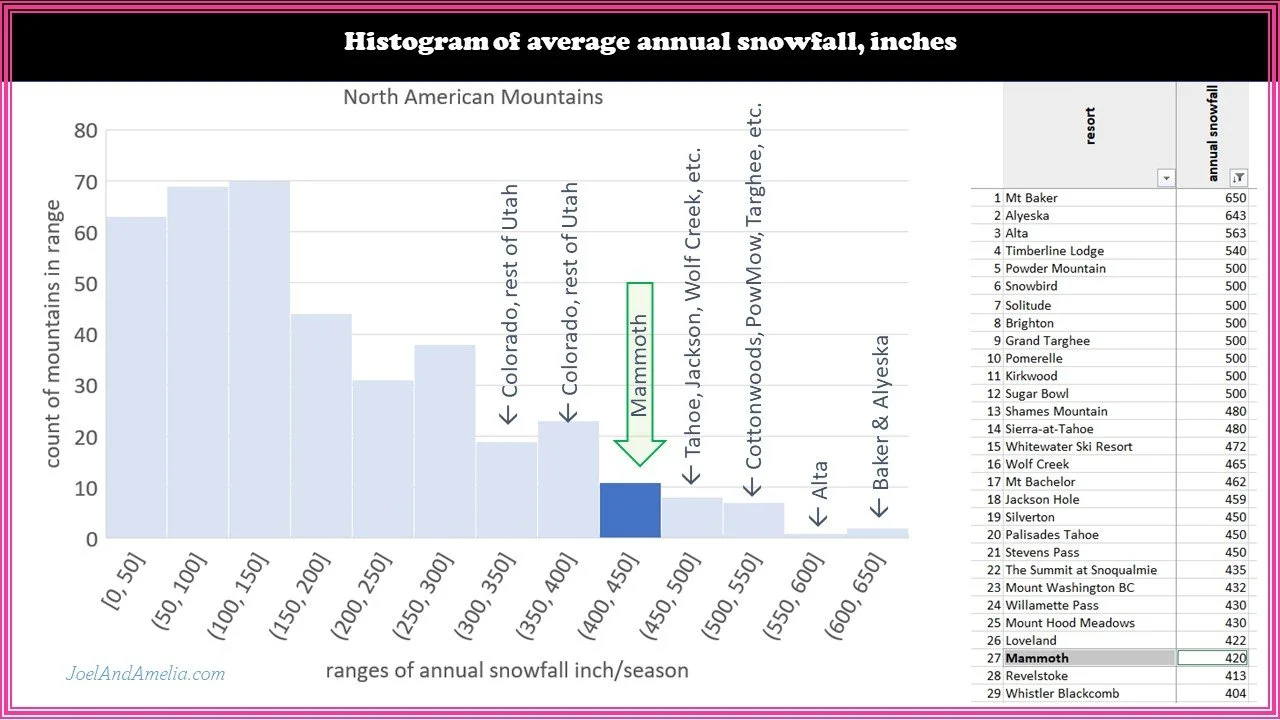 Mammoth’s average annual snowfall scores #27 on my list of about 500 North American ski areas (more on that later). So even on an average year (solid black line) they are getting big dumps. We are presently above the historical maximum (light dashed trace) and >2x above average.