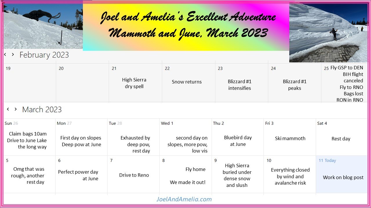 It started as a one-week trip, but snowballed into nearly two. We spent the last week of February and first week of March in the high Sierra ski areas of Mammoth and June.