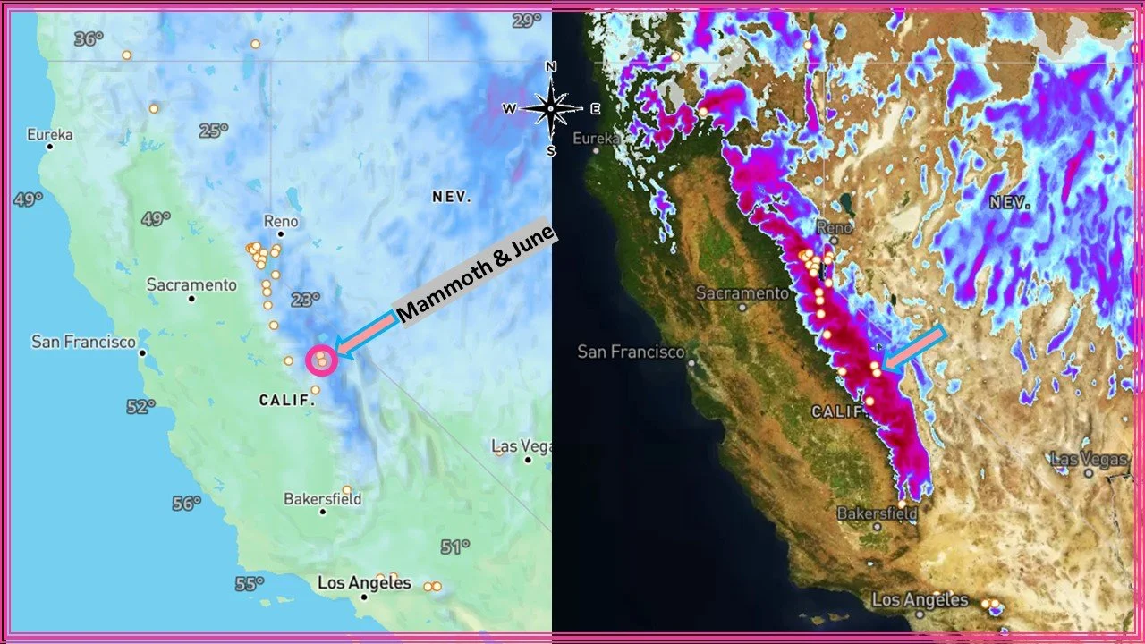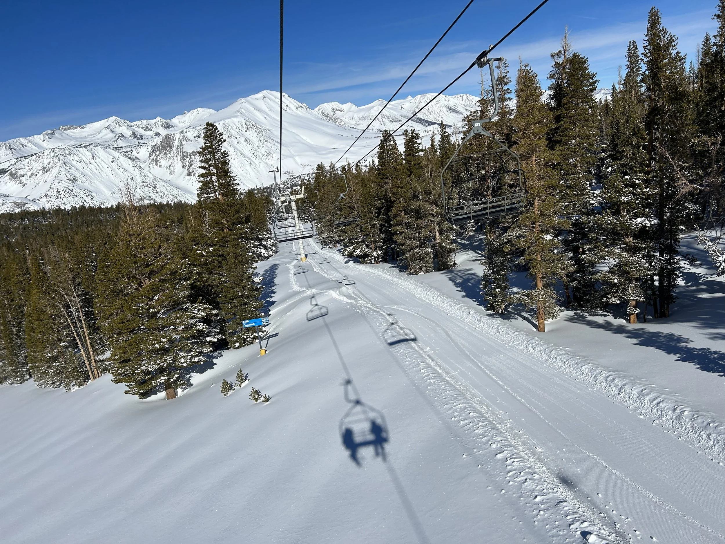 Mammoth is positioned in a snow trap. It sits in the path of prevailing storm patterns that bring loads of moisture from the warm pacific waters and low-elevation coastal flatlands. Mammoth stands tall, but in a somewhat lower corner between two majestic ridges of the eastern Sierra, surrounded by 13-teeners (mountain peaks over 13,000 feet) to the north and 14-teeners to the south. These neighboring ridges are separated by the San Joaquin River. The mighty San Joaquin River Valley creates a “Y” shape and funnels atmospheric rivers up a sharp elevation rise, creating orographic lift, the likes of which are not seen at many other North American ski area.